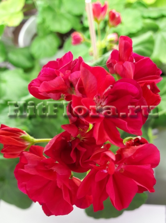 Особенности: Махровая зональная карликовая пеларгония. Образует плотный пышный кустик, растущий не ввысь, а вширь. Обильное цветение крупными шапочками изумительного малинового оттенка. Сорт очень ярок и красив.