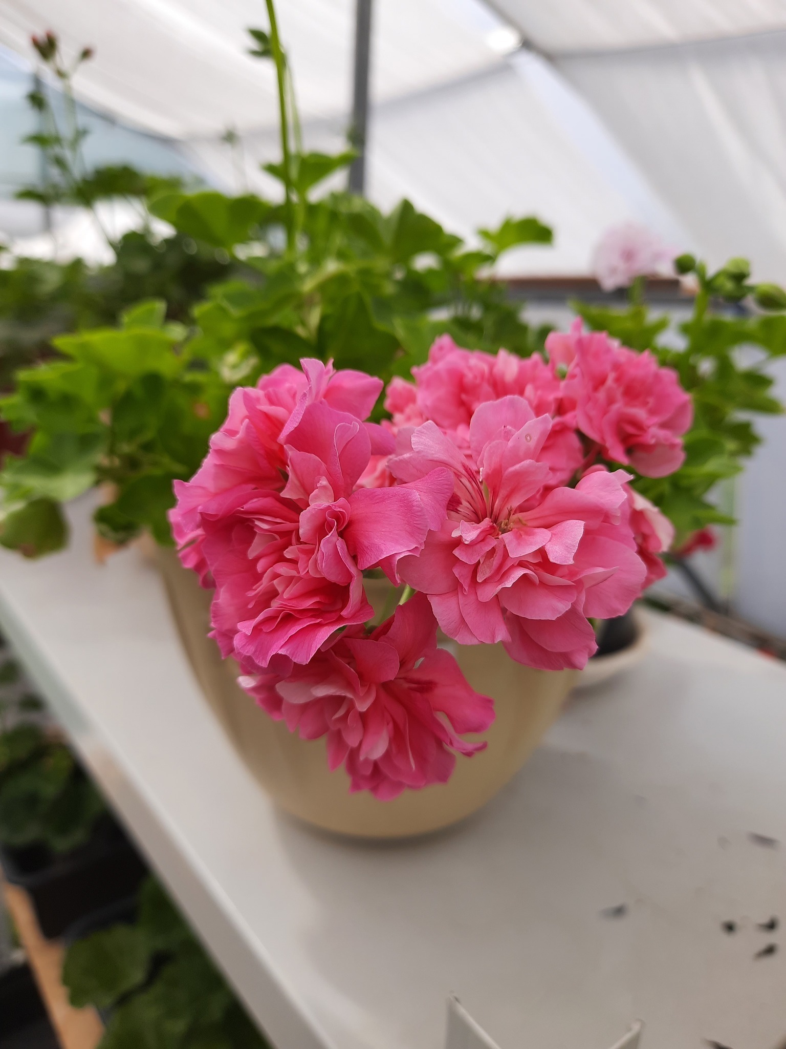 Плющелистная пеларгония - вечнозеленое ампельное растение со свисающими или стелющимися побегами длиной 35-70 см. Листья плющевидные, мясистые, блестящие с восковым налетом. Цветки на длинных цветоносах, простые, махровые или полумахровые, собраны в пышные шапки-соцветия.